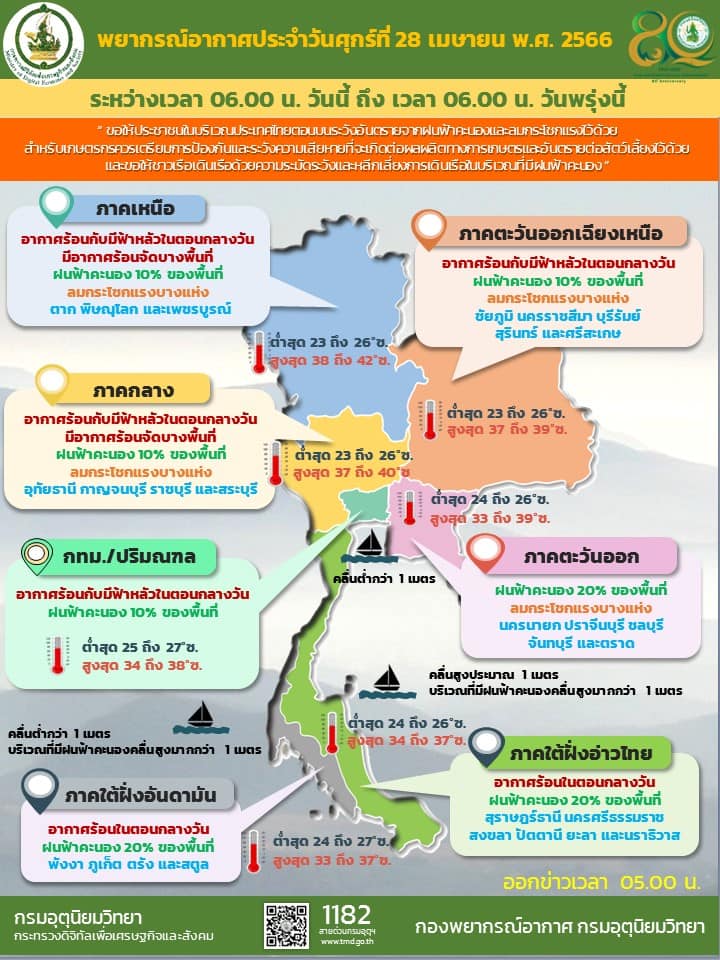 สำหรับลมตะวันออกและลมตะวันออกเฉียงใต้พัดปกคลุมอ่าวไทย ภาคใต้ และทะเลอันดามัน ทำให้ภาคใต้มีฝนเพิ่มขึ้น ขอให้ประชาชนในบริเวณภาคใต้ระวังอันตรายจากฝนฟ้าคะนอง ส่วนบริเวณอ่าวไทย ทะเลมีคลื่นสูงประมาณ 1 เมตร บริเวณที่มีฝนฟ้าคะนองคลื่นสูงมากกว่า 2 เมตร ขอให้ชาวเรือเดินเรือด้วยความระมัดระวังและหลีกเลี่ยงการเดินเรือในบริเวณที่มีฝนฟ้าคะนอง เรือเล็กบริเวณอ่าวไทยควรงดออกจากฝั่ง ในช่วงวันที่ 30 เมษายน – 2 พฤษภาคม 2566. – สำนักข่าวไทย