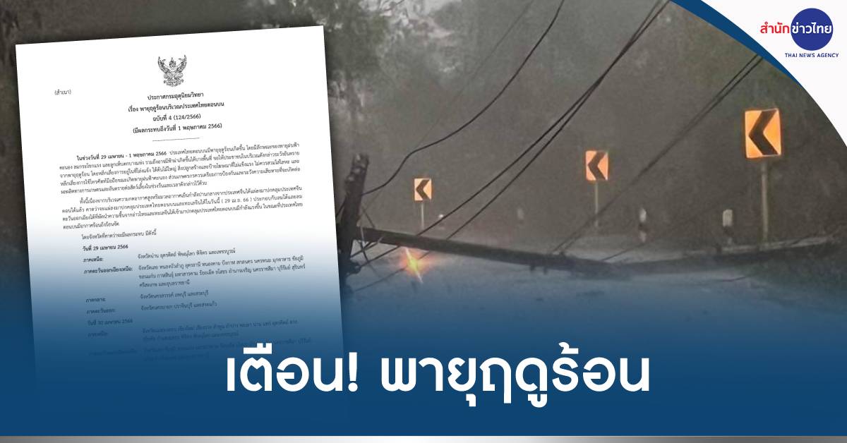 กรมอุตุนิยมวิทยา ออกประกาศฉบับที่ 4 ในช่วงวันที่ 29 เมษายน – 1 พฤษภาคม 2566 ประเทศไทยตอนบนมีพายุฤดูร้อนเกิดขึ้น โดยมีลักษณะของพายุฝนฟ้าคะนอง ลมกระโชกแรง และลูกเห็บตกบางแห่ง รวมถึงอาจมีฟ้าผ่าเกิดขึ้นได้บางพื้นที่ ขอให้ประชาชนในบริเวณดังกล่าวระวังอันตรายจากพายุฤดูร้อน โดยหลีกเลี่ยงการอยู่ในที่โล่งแจ้ง ใต้ต้นไม้ใหญ่ สิ่งปลูกสร้างและป้ายโฆษณาที่ไม่แข็งแรง ไม่ควรสวมใส่โลหะ และหลีกเลี่ยงการใช้โทรศัพท์มือถือขณะเกิดพายุฝนฟ้าคะนอง ส่วนเกษตรกรควรเตรียมการป้องกันและระวังความเสียหายที่จะเกิดต่อผลผลิตทางการเกษตรและอันตรายต่อสัตว์เลี้ยงในช่วงวันและเวลาดังกล่าวไว้ด้วย