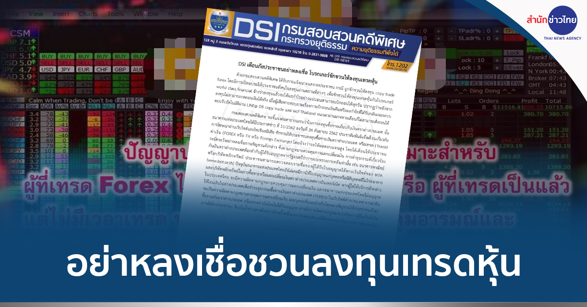 กทม. 3 พ.ค.- กรมสอบสวนคดีพิเศษ แจ้งเตือนภัยประชาชนอย่าหลงเชื่อ โบรกเกอร์ชักชวนให้ลงทุนเทรดหุ้น หลังมีเหยื่อถูกหลอกแจ้งเบาะแส