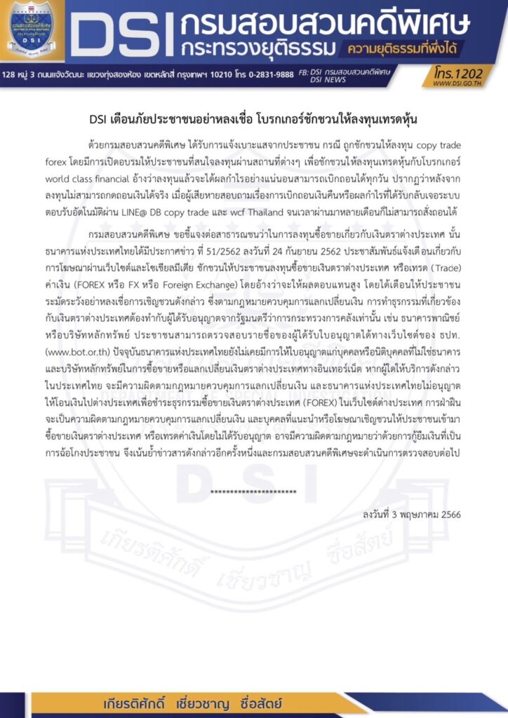 ด้วยกรมสอบสวนคดีพิเศษ ได้รับการแจ้งเบาะแสจากประชาชน กรณี ถูกชักชวนให้ลงทุน copy trade forex โดยมีการเปิดอบรมให้ประชาชนที่สนใจลงทุนผ่านสถานที่ต่างๆ เพื่อชักชวนให้ลงทุนเทรดหุ้นกับโบรกเกอร์ world class financial อ้างว่าลงทุนแล้วจะได้ผลกำไรอย่างแน่นอนสามารถเบิกถอนได้ทุกวัน ปรากฏว่าหลังจากลงทุนไม่สามารถกดถอนเงินได้จริง เมื่อผู้เสียหายสอบถามเรื่องการเบิกถอนเงินคืนหรือผลกำไรที่ได้รับกลับเจอระบบตอบรับอัตโนมัติผ่าน LINE@ DB copy trade และ wcf Thailand จนเวลาผ่านมาหลายเดือนก็ไม่สามารถสั่งถอนได้