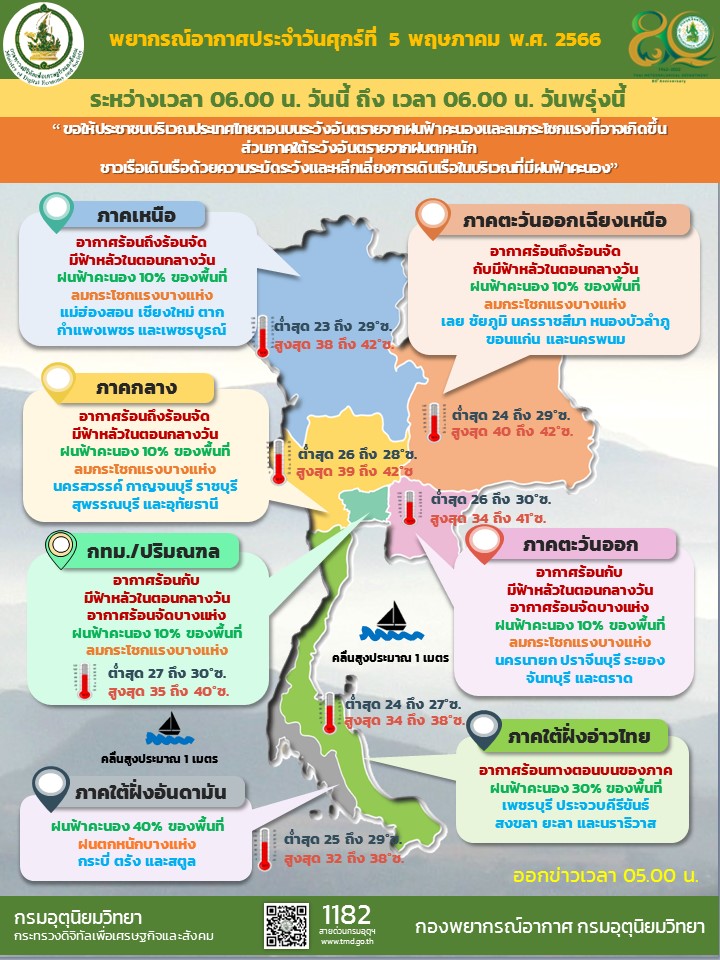 กรุงเทพฯ 5 พ.ค. – กรมอุตุฯ เผยไทยตอนบน อากาศร้อนถึงร้อนจัด และมีฝนฟ้าคะนอง-ลมกระโชกแรงบางแห่ง ส่วนภาคใต้ฝนตกหนักบางพื้นที่