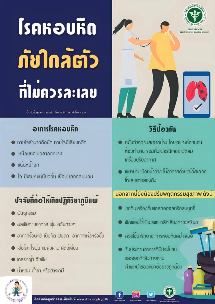 กทม. 6 พ.ค.-กรมการแพทย์ โดยสถาบันโรคทรวงอก แนะผู้ป่วยโรคหอบหืดดูแลตนเองในช่วงอากาศกำลังเข้าสู่ฤดูฝน อากาศชื้น ปัจจัยต่างๆที่จะเป็นตัวกระตุ้นให้เกิดอาการ หากไม่ได้รับการรักษาอย่างถูกต้องอาจได้รับอันตรายถึงชีวิต