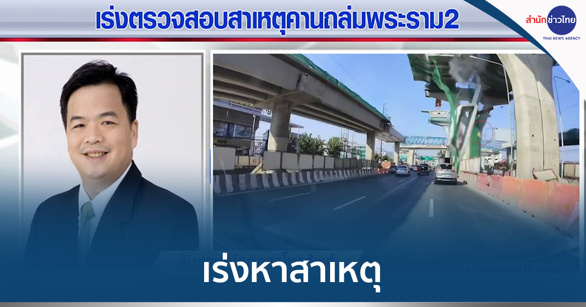 7 พ.ค.-คานสร้างทางด่วนถนนพระราม 2 ร่วงทับคนงานดับ “สุรเชษฐ์ เหล่าพูลสุข” ผู้ว่าการ กทพ. แจงเหล็กยึดคานขาด ทำให้คานร่วงลงมาด้านล่าง ทับคนงานเสียชีวิต 1 ราย บาดเจ็บอีก 1 ราย รถยนต์เสียหาย 4 คัน ย้ำดูแลเยียวยาเต็มที่ ขณะนี้ได้เร่งเคลียร์พื้นที่ ยกแผ่นคอนกรีตไว้เกาะกลางถนน ส่วนสาเหตุรอเจ้าหน้าที่ตรวจสอบ เบื้องต้นสั่งชะลอการก่อสร้างชั่วคราว 7 วัน ขณะที่การจราจรติดขัดหนัก.-สำนักข่าวไทย