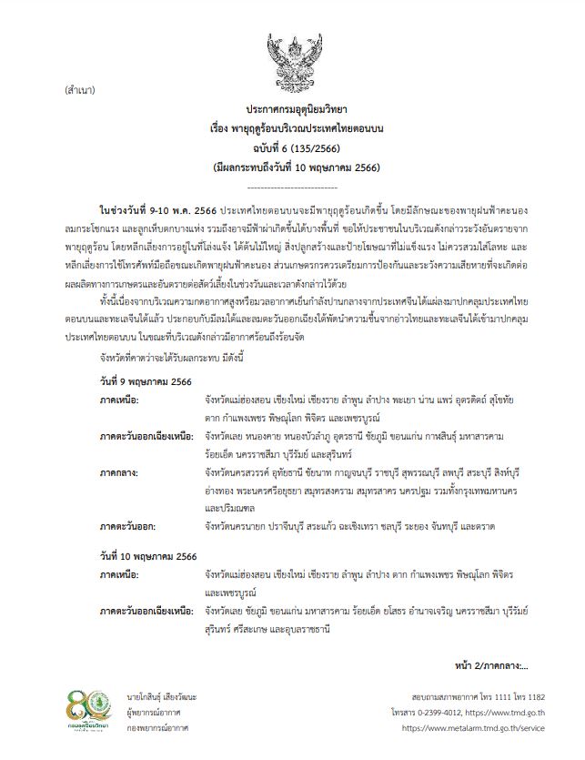 กรมอุตุฯ ออกประกาศเตือนพายุฤดูร้อนบริเวณประเทศไทยตอนบน ฉบับที่ 6 (135/2566) (มีผลกระทบถึงวันที่ 10 พฤษภาคม 2566)