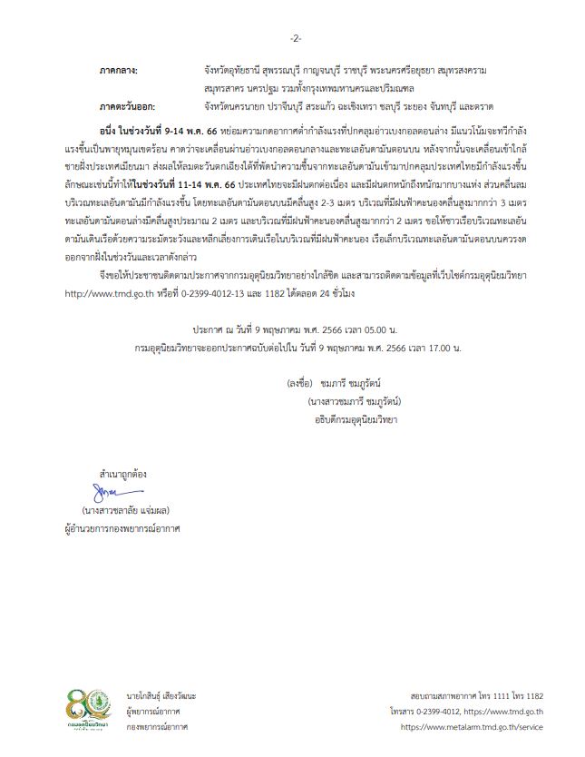 ประกาศ ณ วันที่ 9 พฤษภาคม พ.ศ. 2566 เวลา 05.00 น. กรมอุตุนิยมวิทยาจะออกประกาศฉบับต่อไปในวันที่ 9 พฤษภาคม พ.ศ. 2566 เวลา 17.00 น. -สำนักข่าวไทย