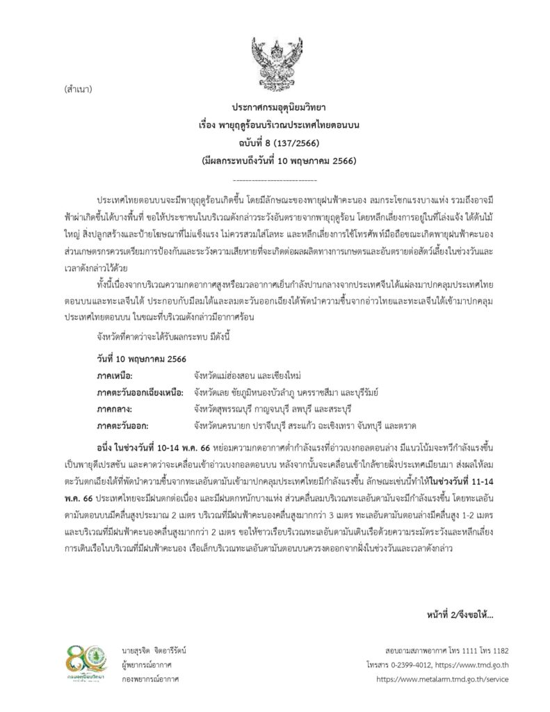 ประกาศกรมอุตุนิยมวิทยา เรื่อง พายุฤดูร้อนบริเวณประเทศไทยตอนบน ฉบับที่ 8 (137/2566) มีผลกระทบถึงวันที่ 10 พฤษภาคม 2566