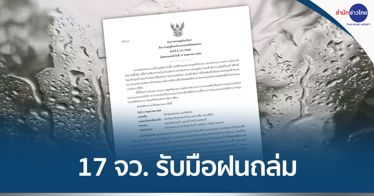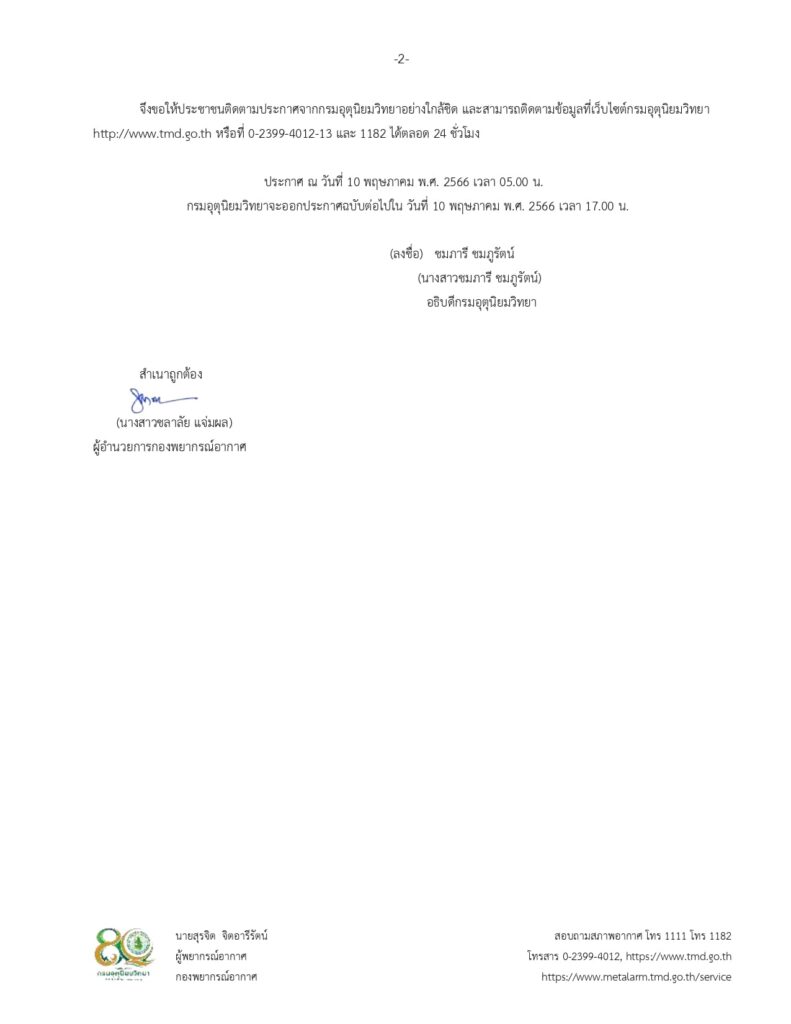 ประกาศ ณ วันที่ 10 พฤษภาคม พ.ศ. 2566 เวลา 05.00 น. กรมอุตุนิยมวิทยาจะออกประกาศฉบับต่อไปใน วันที่ 10 พฤษภาคม พ.ศ. 2566 เวลา 17.00 น. -สำนักข่าวไทย