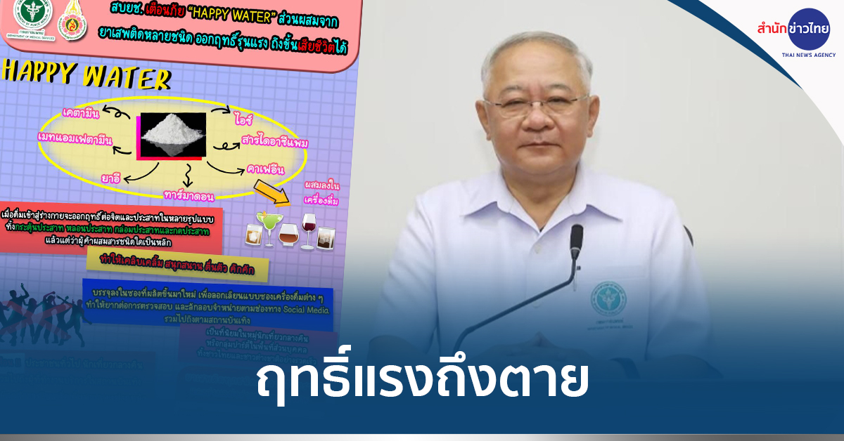 กรุงเทพฯ 11 พ.ค. – แพทย์เตือนภัย “HAPPY WATER” ส่วนผสมจากยาเสพติดหลายชนิด ออกฤทธิ์ต่อจิตและประสาท อันตรายถึงขั้นเสียชีวิต แนะประชาชน กลุ่มนักเที่ยว คนทำงานสถานบันเทิง ระมัดระวังไม่รับเครื่องดื่มจากคนแปลกหน้า