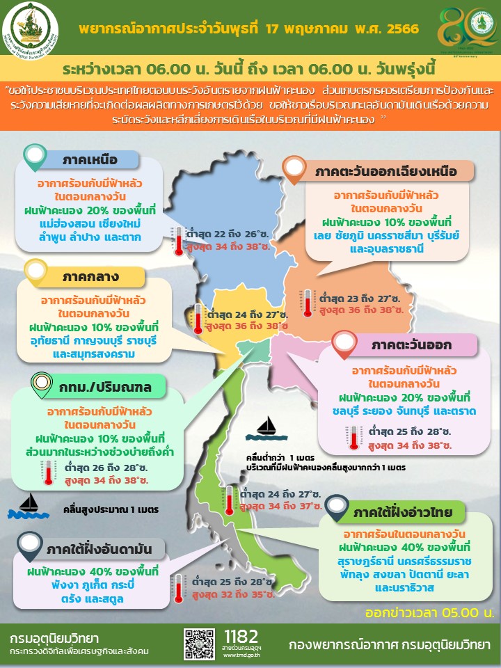 กรมอุตุฯ 17 พ.ค. – กรมอุตุฯ เผยทั่วไทยมีฝนลดลง แต่ยังคงมีฝนฟ้าคะนองบางพื้นที่ และมีอากาศร้อนในตอนกลางวัน ส่วนกรุงเทพฯ-ปริมณฑล ฝนฟ้าคะนอง 10% ของพื้นที่