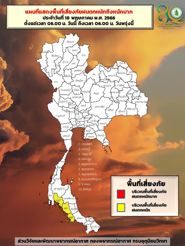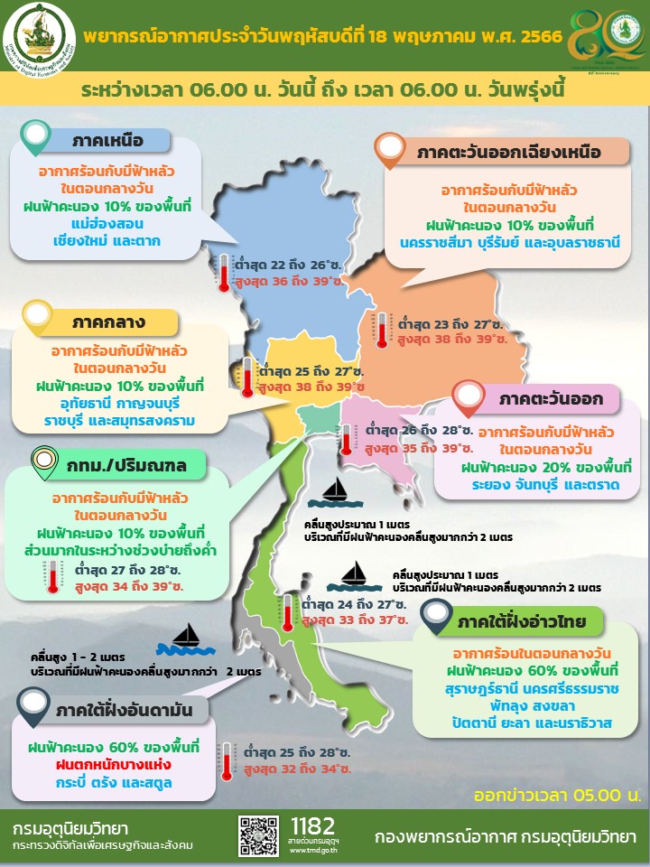 กรมอุตุฯ 18 พ.ค. – กรมอุตุฯ เผยไทยตอนบนมีฝนน้อย แต่ยังคงมีฝนฟ้าคะนองบางพื้นที่ ขณะที่ภาคใต้มีฝนฟ้าคะนองเพิ่มขึ้นและตกหนักบางแห่ง ส่วนกรุงเทพฯ-ปริมณฑล อากาศร้อน กับมีฝนฟ้าคะนอง 10% ของพื้นที่