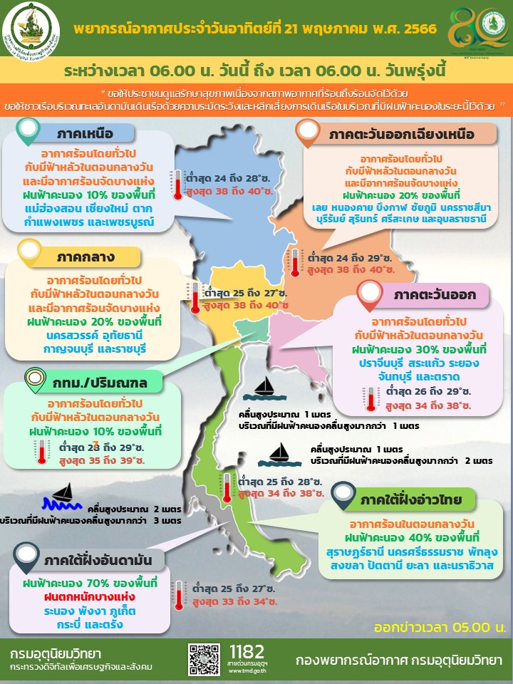กทม. 21 พ.ค.- กรมอุตุฯ เผยประเทศไทยอากาศร้อนถึงร้อนจัด มีฟ้าหลัวตอนกลางวัน โดยมีฝนฟ้าคะนองบางแห่ง เตรียมเข้าสู่ฤดูฝน 22 พ.ค.นี้