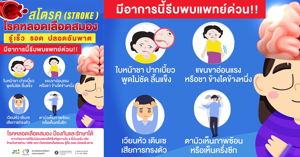 กทม. 24 พ.ค.- สถาบันประสาทวิทยา กรมการแพทย์ แนะประชาชนในการดูแลป้องกันตนเองจากโรคหลอดเลือดสมอง หาก มีอาการ แขนขาอ่อนแรง ปากเบี้ยว พูดลำบาก มองเห็นภาพซ้อนแบบเฉียบพลัน ควรรีบไปโรงพยาบาลทันที ภายใน 4 ชั่วโมงครึ่ง เพื่อให้ได้รับการรักษาที่ถูกต้องรวดเร็ว “รู้เร็ว รอด ปลอดอัมพาต”