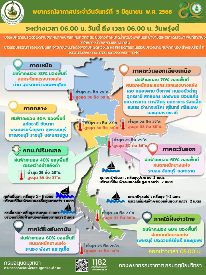 กรมอุตุฯ 5 มิ.ย. – กรมอุตุฯ เผยทั่วไทยมีฝนฟ้าคะนองเพิ่มขึ้น โดยมีฝนตกหนักบางแห่งบริเวณภาคตะวันออกและภาคใต้ ทะเลอันดามันและอ่าวไทยมีคลื่นลมแรง