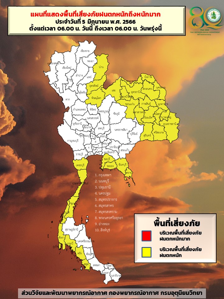 กรมอุตุนิยมวิทยา พยากรณ์อากาศ 24 ชั่วโมงข้างหน้า ประเทศไทยมีฝนฟ้าคะนองเพิ่มขึ้น โดยมีฝนตกหนักบางแห่ง ขอให้ประชาชนในบริเวณดังกล่าวระวังอันตรายจากฝนตกหนักและฝนที่ตกสะสม ซึ่งอาจทำให้เกิดน้ำท่วมฉับพลันและน้ำป่าไหลหลาก โดยเฉพาะพื้นที่ลาดเชิงเขา ใกล้ทางน้ำไหลผ่าน และพื้นที่ลุ่ม ทั้งนี้ เนื่องจากมรสุมตะวันตกเฉียงใต้กำลังค่อนข้างแรงที่พัดปกคลุมทะเลอันดามัน ประเทศไทย และอ่าวไทย มีกำลังแรงขึ้น ประกอบกับมีหย่อมความกดอากาศต่ำกำลังแรงปกคลุมชายฝั่งประเทศเมียนมา และร่องมรสุมพาดผ่านภาคตะวันออกเฉียงเหนือและประเทศลาว เข้าสู่หย่อมความกดอากาศต่ำบริเวณทะเลจีนใต้