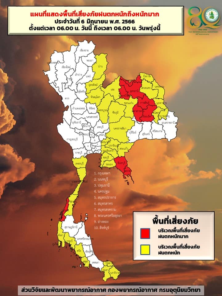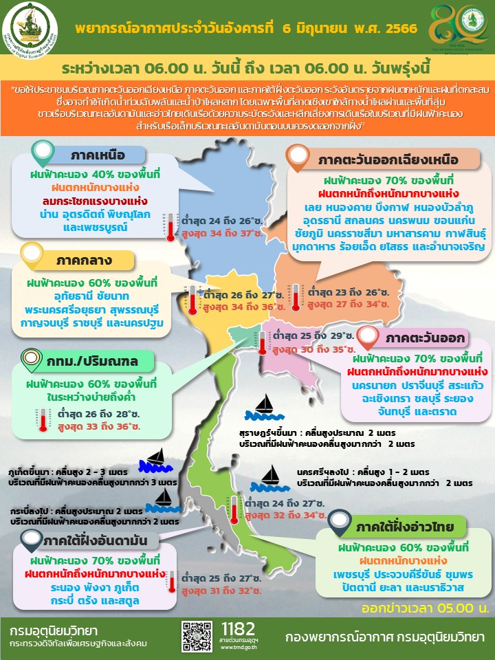 กรมอุตุฯ 6 มิ.ย. – กรมอุตุฯ เผยทั่วไทยมีฝนเพิ่มขึ้น กับมีฝนตกหนักถึงหนักมาก บริเวณภาคอีสาน ภาคตะวันออก และภาคใต้ฝั่งตะวันตก ระวังน้ำท่วมฉับพลัน-น้ำป่าไหลหลาก ทะเลมีคลื่นลมแรง ส่วนกรุงเทพฯ-ปริมณฑล ฝนฟ้าคะนอง 60% ของพื้นที่ ช่วงบ่ายถึงค่ำ