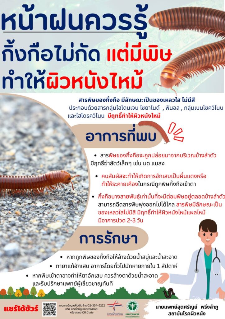 นายแพทย์สกานต์ บุนนาค ผู้อำนวยการสถาบันโรคผิวหนัง กรมการแพทย์ กล่าวเพิ่มเติมว่า สารพิษของกิ้งกือมีลักษณะเป็นของเหลวใสไม่มีสี ประกอบด้วยสารกลุ่มไฮโดนเจน ไซยาไนด์ (Hydrogen cyanide) ฟีนอล (Phenol) กลุ่มเบนโซควิโนน และไฮโดรควิโนน (Benzoquinones/hydroquinones) ซึ่งมีฤทธิ์ทำให้ผิวหนังมีแผลไหม้ได้ และบางรายอาจจะมีอาการปวด รวมทั้งการระคายเคืองของผิวหนังร่วมด้วย ทั้งนี้ หากถูกพิษของกิ้งกือให้ล้างออกด้วยน้ำสบู่และน้ำสะอาดโดยทันที สามารถทายาแก้อักเสบ และให้การรักษาได้ตามอาการ โดยทั่วไปอาการมักจะหายภายใน 1 สัปดาห์ หากมีอาการรุนแรงให้รีบมาพบแพทย์ผู้เชี่ยวชาญโดยทันที.-สำนักข่าวไทย