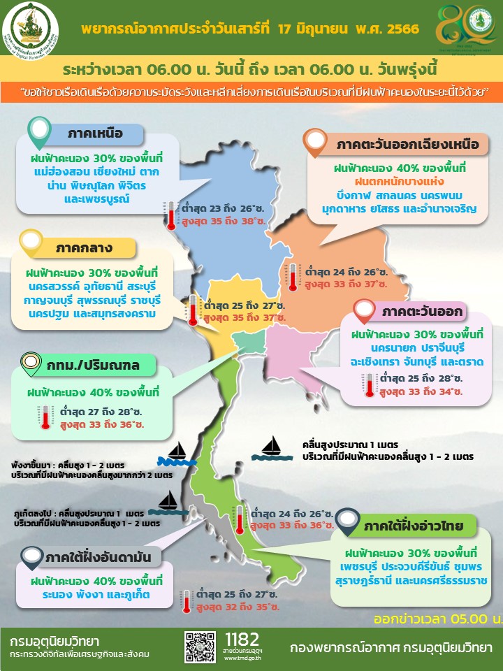 - ภาคตะวันออกเฉียงเหนือ มีฝนฟ้าคะนอง ร้อยละ 40 ของพื้นที่ และมีฝนตกหนักบางแห่ง บริเวณจังหวัดบึงกาฬ สกลนคร นครพนม มุกดาหาร ยโสธร และอำนาจเจริญ อุณหภูมิต่ำสุด 24-26 องศาเซลเซียส อุณหภูมิสูงสุด 33-37 องศาเซลเซียส ลมตะวันตกเฉียงใต้ ความเร็ว 10-20 กม./ชม.