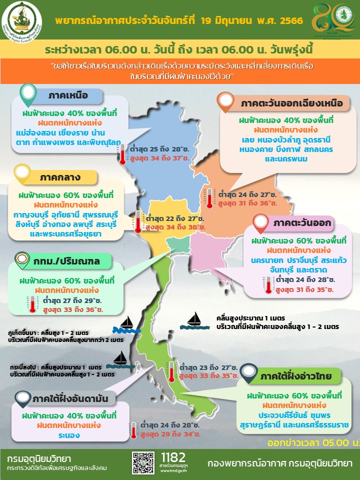 กรุงเทพฯ 19 มิ.ย.- ทั่วไทยยังคงมีฝนฟ้าคะนองและมีฝนตกหนักบางแห่ง ส่วนมากบริเวณด้านรับมรสุม กทม.-ปริมณฑล ฝนฟ้าคะนอง 60% ของพื้นที่ ส่วนคลื่นลมบริเวณทะเลอันดามันและอ่าวไทยมีกำลังปานกลาง