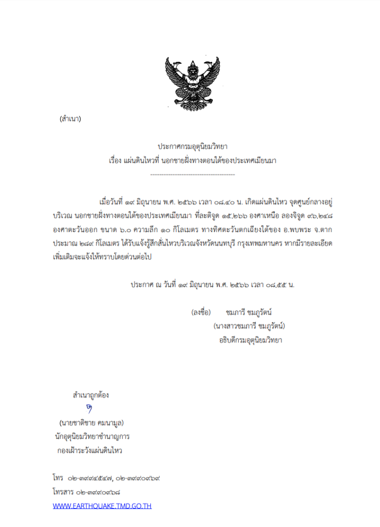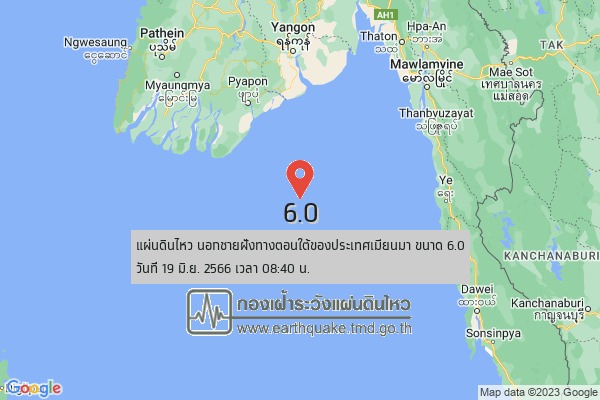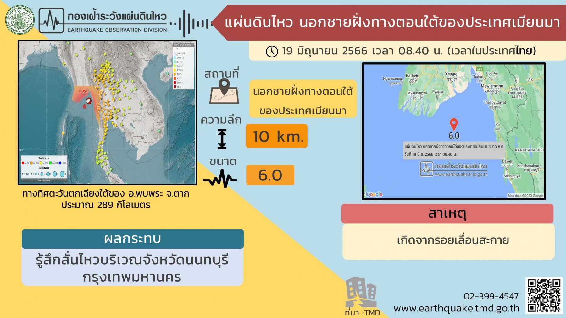 กองเฝ้าระวังแผ่นดินไหว กรมอุตุนิยมวิทยา รายงานเมื่อเวลา 08.40 น. (19 มิ.ย.66) เกิดแผ่นดินไหว ขนาด 6.0 ลึก 10 กม. บริเวณนอกชายฝั่งทางตอนใต้ของเมียนมา ห่างจากทางทิศตะวันตกเฉียงใต้ของ อ.พบพระ จ.ตาก ประมาณ 289 กม. มีรายงานรับรู้แรงสั่นไหวถึงพื้นที่กรุงเทพฯ โดยเฉพาะตึกสูงบริเวณ ราชดำริ ปทุมวัน วัฒนา หลักสี่ จตุจักร สาทรส่วนที่ตึกกรมทรัพย์สินทางปัญญา กระทรวงพาณิชย์ ประชาชนแจ้งป้ายแขวนที่เพดานแกว่งซ้ายขวา ประมาณ 30 วินาที