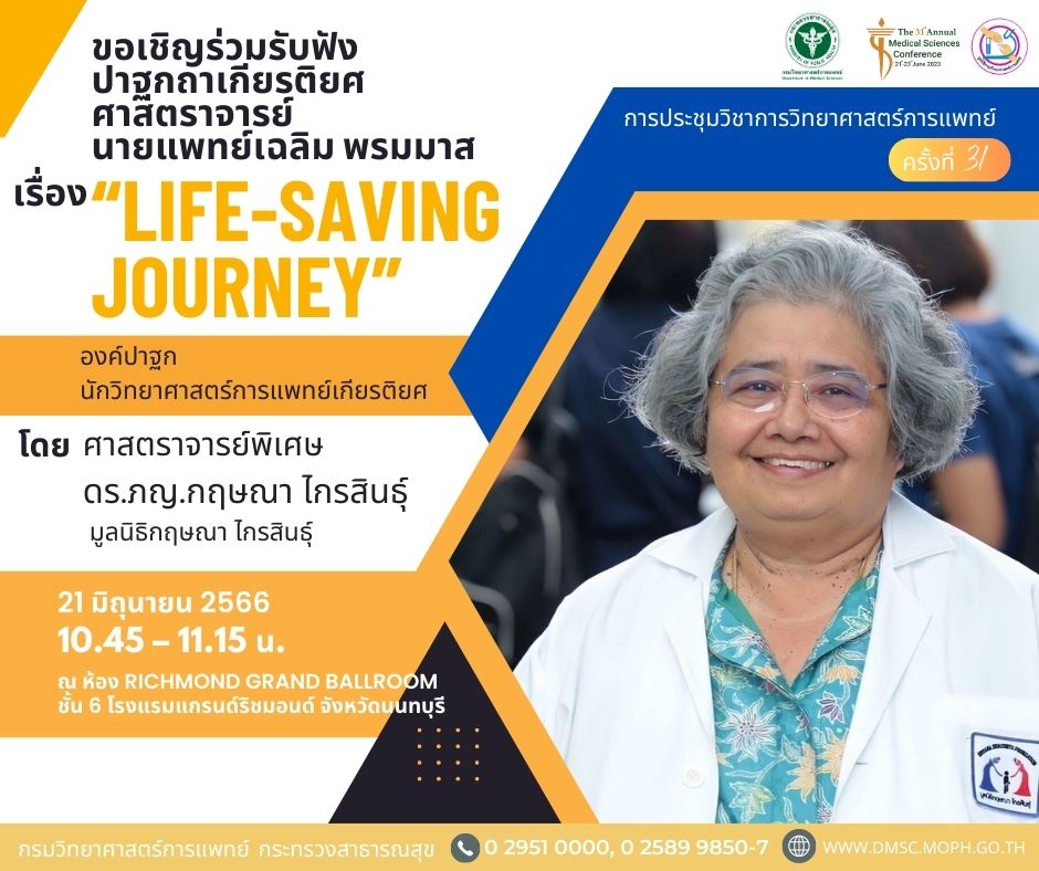 “การประชุมวิชาการวิทยาศาสตร์การแพทย์ ครั้งที่ 31 ประจำปี 2566 ภายใต้หัวข้อ “Smart Medical Sciences : Health for Wealth วิทยาศาสตร์การแพทย์ชาญฉลาด เพื่อสุขภาพที่ดีและเศรษฐกิจมั่งคั่ง” จัดขึ้นระหว่างวันที่ 21 – 23 มิถุนายน 2566 ณ โรงแรมแกรนด์ริชมอนด์ จังหวัดนนทบุรี ในรูปแบบ Hybrid ทั้ง Onsite และ Online ทั้งนี้ ผู้ที่สนใจสามารถติดตามรับฟังปาฐกถาเกียรติยศ ศาสตราจารย์นายแพทย์เฉลิม พรมมาส เรื่อง “Life-saving Journey” องค์ปาฐก นักวิทยาศาสตร์การแพทย์เกียรติยศ โดย ศาสตราจารย์ (พิเศษ) ดร.เภสัชกรหญิงกฤษณา ไกรสินธุ์ มูลนิธิกฤษณา ไกรสินธุ์ ได้ทางเพจเฟซบุ๊กการประชุมวิชาการวิทยาศาสตร์การแพทย์ เวลา 10.45-11.15 น.”. -สำนักข่าวไทย