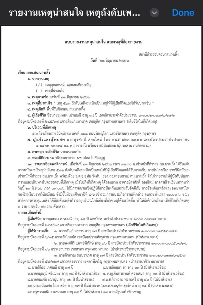มีรายงานข่าวแจ้งว่า เจ้าหน้าที่ป้องกันและบรรเทาสารณภัย สถานีดับเพลิงสามเสน ที่จัดกิจกรรมซักซ้อมเผชิญเหตุไฟไหม้ทั้งหมด 8 คน ทราบชื่อคือ 1.นายสมเจน ชูทอง หน.ชุดมาร่วมพิธีเปิด 2.นายชูศักดิ์ จันทรา บรรยายห้องประชุม 3.นายฤทธิ์เดช กิจขยัน บรรยายห้องประชุม 4.นายวรวุฒิ สง่าแสง อยู่ที่รถ 5.นายธีรวัฒน์ เทียนทองดี อยู่ที่รถ ส่วนอีก 3 ราย คือ 6.นายณภัทร ลอยเมฆ 7.นายอรรถพล บุทองรัตน์ 8.นายชาติอาชไนย บุญเกตุ เป็นวิทยากรบรรยายภาคปฏิบัติ ณ ที่เกิดเหตุ ถูกแจ้งข้อกล่าวหาร่วมกันกระทำโดยประมาท และการกระทำนั้นเป็นเหตุให้ผู้อื่นถึงแก่ความตาย, ร่วมกระทำโดยประมาท และการกระทำนั้นเป็นเหตุให้ผู้อื่นรับอันตรายแก่กายหรือจิตใจ. -สำนักข่าวไทย