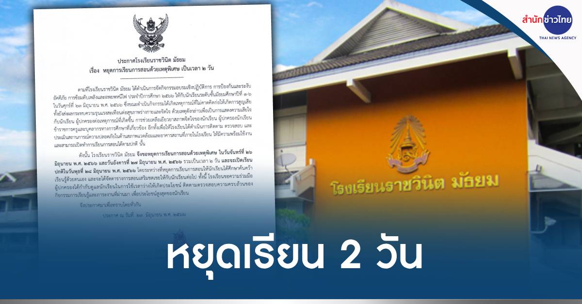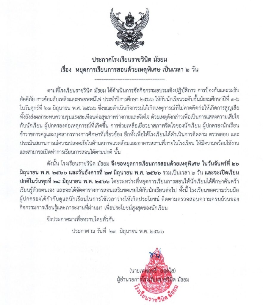 กทม. 24 มิ.ย.-โรงเรียนราชวินิตมัธยม ประกาศหยุดการเรียนการสอนด้วยเหตุพิเศษ 2 วัน วันที่ 26-27 มิ.ย.66 เพื่อแสดงความเสียใจกับนักเรียน ผู้ปกครอง พร้อมเยียวยาสภาพจิตใจนักเรียน