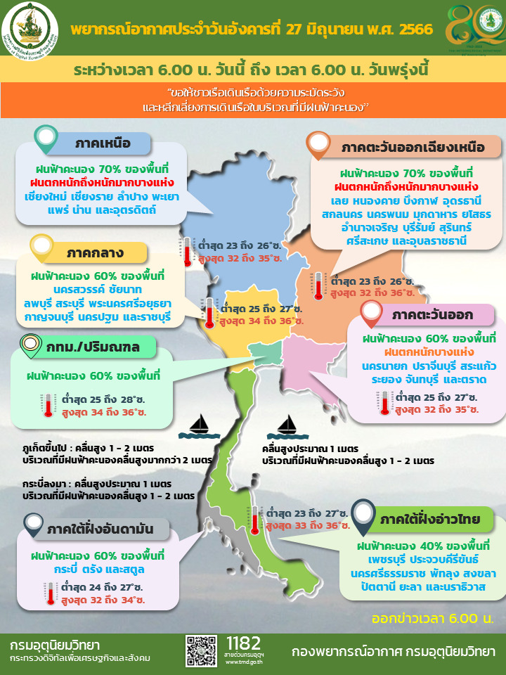 กรมอุตุฯ 27 มิ.ย. – กรมอุตุฯ เผยทั่วไทยมีฝนเพิ่มขึ้น และตกหนักบางแห่งในภาคตะวันออก โดยมีฝนตกหนักมากในภาคเหนือ-อีสาน ระวังน้ำท่วมฉับพลันและน้ำป่าไหลหลาก ส่วนกรุงเทพฯ-ปริมณฑล ฝนฟ้าคะนอง 60% ของพื้นที่