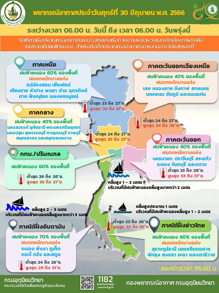 กรมอุตุฯ 30 มิ.ย. – กรมอุตุฯ เผยทั่วไทยยังคงมีฝนฟ้าคะนอง กับมีฝนตกหนักบางแห่งในภาคเหนือตอนบน ภาคอีสาน ภาคตะวันออก และภาคใต้ ส่วนกรุงเทพฯ-ปริมณฑล ฝนฟ้าคะนอง 60% ของพื้นที่