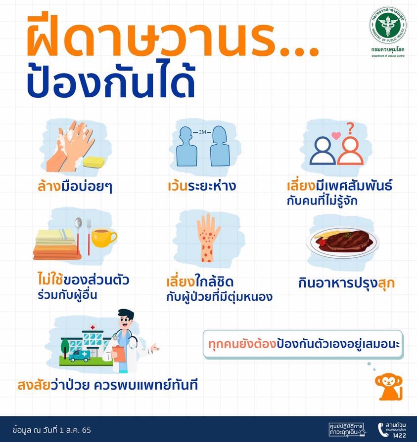 นายแพทย์โสภณ เอี่ยมศิริถาวร รองอธิบดีกรมควบคุมโรค กล่าวเพิ่มเติมว่า สถานการณ์โรคฝีดาษวานรระบาดเพิ่มขึ้นรวดเร็วในเวลาเดือนเดียว สะท้อนถึงพฤติกรรมเสี่ยงที่ทำให้เกิดการแพร่เชื้อในเพศชายวัยเจริญพันธุ์ โดยเฉพาะกลุ่มชายมีเพศสัมพันธ์กับชาย กรมควบคุมโรคจึงขอความร่วมมือเครือข่ายที่ทำงานใกล้ชิดกับประชาชน เช่น โรงพยาบาล และคลินิกเอกชน องค์กรภาคประชาสังคม สถานประกอบการสุขภาพ ประเภทสปา ซาวน่า ให้ช่วยกันประชาสัมพันธ์ให้ความรู้ และคำแนะนำในการสังเกตอาการโรคฝีดาษวานรสำหรับประชาชน เพื่อสร้างความรู้ความเข้าใจที่ถูกต้อง และการป้องกันโรคฝีดาษวานรแก่ประชาชนกลุ่มเป้าหมายที่มีความเสี่ยง โดยเน้นย้ำว่า “โรคฝีดาษวานร” สามารถป้องกันได้โดยงดการสัมผัสแนบชิดกับผิวหนังผู้ป่วยและไม่ใช้สิ่งของร่วมกัน นอกจากการสวมถุงยางอนามัยเมื่อมีเพศสัมพันธ์ ให้สังเกตตุ่มหนองในบริเวณที่มีโอกาสสัมผัสแนบเนื้อ เพื่อป้องกันความเสี่ยงรับเชื้อจากการสัมผัส