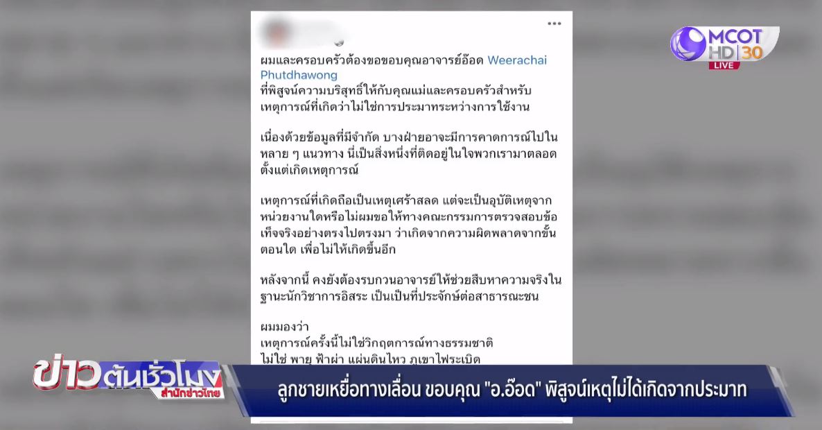 กรุงเทพฯ 7 ก.ค. – ลูกชายเหยื่อทางเลื่อนดอนเมือง ขอบคุณ “อ.อ๊อด” ช่วยพิสูจน์ความบริสุทธิ์ให้แม่และครอบครัว ว่าเหตุที่เกิดขึ้นไม่ได้เกิดจากความประมาท พร้อมขอให้มีการตรวจสอบข้อเท็จจริงอย่างตรงไปตรงมา