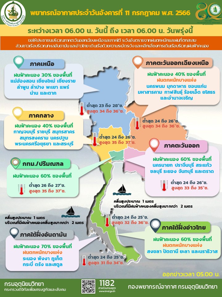 กรมอุตุนิยมวิทยา พยากรณ์อากาศ 24 ชั่วโมงข้างหน้า มรสุมตะวันตกเฉียงใต้พัดปกคลุมทะเลอันดามัน ประเทศไทย และอ่าวไทย ลักษณะเช่นนี้ทำให้ประเทศไทยมีฝนฟ้าคะนองและมีฝนตกหนักบางแห่งในภาคตะวันออกเฉียงเหนือ และภาคใต้ ขอให้ประชาชนในบริเวณดังกล่าวระวังอันตรายจากฝนตกหนักและฝนที่ตกสะสมไว้ด้วย สำหรับบริเวณทะเลอันดามันมีคลื่นสูงประมาณ 1 เมตร บริเวณที่มีฝนฟ้าคะนองคลื่นสูงมากกว่า 2 เมตร ขอให้ชาวเรือบริเวณทะเลอันดามันและอ่าวไทยเดินเรือด้วยความระมัดระวังและหลีกเลี่ยงการเดินเรือในบริเวณที่มีฝนฟ้าคะนองในระยะนี้