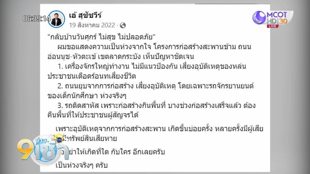 จากนั้น ดร.เอ้ ยังโพสต์ฉะอีกครั้ง วันที่ 19 สิงหาคม 2565 ว่า “กลับบ้านวันศุกร์ ไม่สุข ไม่ปลอดภัย ผมขอแสดงความเป็นห่วงจากใจ โครงการก่อสร้างสะพานข้าม ถนนอ่อนนุช-หัวตะเข้ เขตลาดกระบัง เห็นปัญหาชัดเจน” พร้อมระบุถึงปัญหาที่พบ 3 ข้อใหญ่ๆ ถึงเครื่องจักรขนาดใหญ่ทำงานโดยที่ไม่มีแนวป้องกัน เสี่ยงอุบัติเหตุของหล่น จะทำให้ประชาชนเดือดร้อน อีกทั้งถนนยุบจากการก่อสร้าง เสี่ยงอุบัติเหตุ โดยเฉพาะรถจักรยานยนต์ และสุดท้ายการจราจรติดขัดสาหัส เพราะโครงการก่อสร้างกินพื้นที่กว้าง แม้ว่าบางช่วงก่อสร้างเสร็จแล้ว ก็ต้องคืนให้ประชาชนสัญจรได้ เพราะอุบัติเหตุจากการก่อสร้างสะพาน เกิดขึ้นบ่อยหลายครั้ง และทิ้งท้ายว่า “ขออย่าให้เกิดที่ใด กับใครอีกเลยครับ เป็นห่วงจริงๆ”