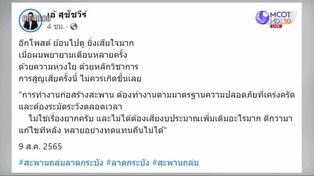 กทม. 11 ก.ค. – ย้อนโพสต์ “ดร.เอ้ สุชัชวีร์” เคยเตือนปัญหาหลายอย่างของการก่อสร้างทางยกระดับถนนอ่อนนุช-ลาดกระบัง เมื่อปีที่แล้ว สุดท้ายพังลงมา มีคนสูญเสียจนได้
