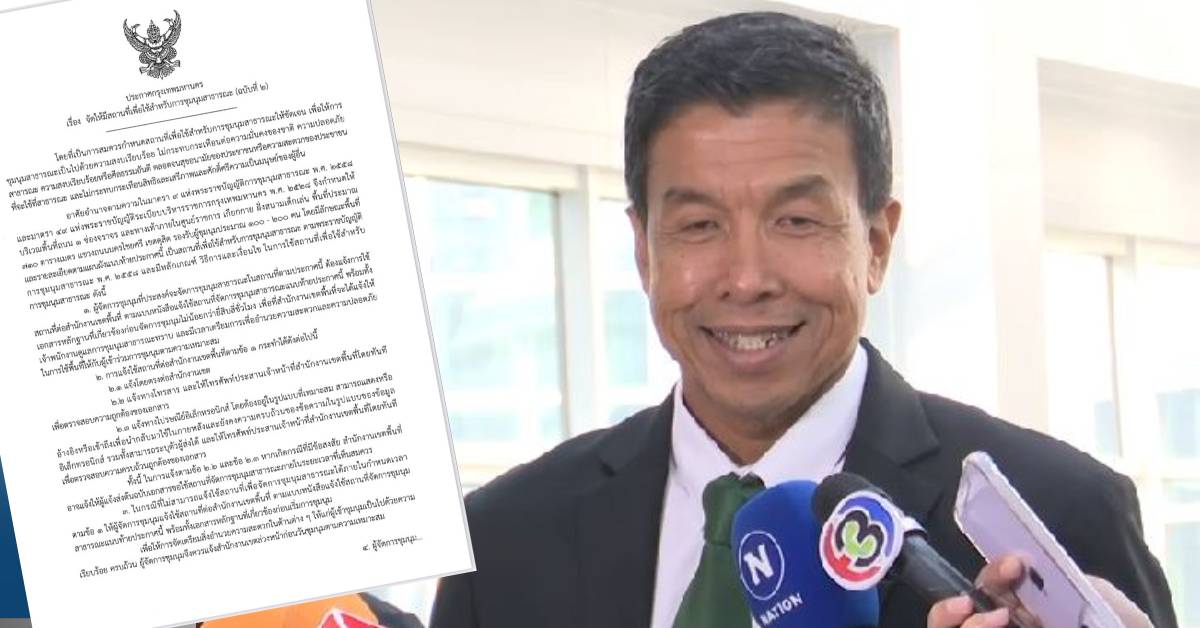 นายชัชชาติ สิทธิพันธุ์ ผู้ว่าฯ กทม. เปิดเผยว่าได้ลงนามประกาศกรุงเทพมหานครเรื่อง จัดให้มีสถานที่เพื่อใช้สำหรับการชุมนุมสาธารณะ (ฉบับที่ 2) โดยที่เป็นการสมควรกำหนดสถานที่เพื่อใช้สำหรับการชุมนุมสาธารณะให้ชัดเจน เพื่อให้การชุมนุมสาธารณะเป็นไปด้วยความสงบเรียบร้อย ไม่กระทบกระเทือนต่อความมั่นคงของชาติ ความปลอดภัยสาธารณะ ความสงบเรียบร้อยหรือศีลธรรมอันดี จึงกำหนดให้บริเวณพื้นที่ถนน 1 ช่องจราจร และทางเท้าภายในศูนย์ราชการ เกียกกาย ฝั่งสนามเด็กเล่น พื้นที่ประมาณ 710 ตารางเมตร แขวงถนนนครไชยศรี เขตดุสิต รองรับผู้ชุมนุมประมาณ 100-200 คน โดยมีลักษณะพื้นที่และรายละเอียดตามแผนผังแนบท้ายประกาศนี้ เป็นสถานที่เพื่อใช้สำหรับการชุมนุมสาธารณะ ตามพระราชบัญญัติการชุมนุมสาธารณะ พ.ศ.2558 และมีหลักเกณฑ์ วิธีการและเงื่อนไขในการใช้สถานที่เพื่อใช้สำหรับการชุมนุมสาธารณะ