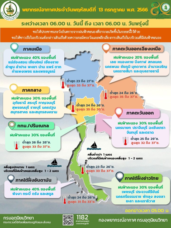 กรมอุตุนิยมวิทยา พยากรณ์อากาศ 24 ชั่วโมงข้างหน้า มรสุมตะวันตกเฉียงใต้ที่พัดปกคลุมทะเลอันดามัน ประเทศไทย และอ่าวไทยมีกำลังอ่อนลง แต่ยังคงมีฝนฟ้าคะนองเกิดขึ้นได้ ส่วนมากบริเวณด้านรับมรสุม ขอให้ประชาชนระวังอันตรายจากฝนฟ้าคะนองที่อาจจะเกิดขึ้นในระยะนี้ไว้ด้วย สำหรับบริเวณทะเลอันดามันมีคลื่นสูงประมาณ 1 เมตร บริเวณที่มีฝนฟ้าคะนองคลื่นสูง 1 – 2 เมตร ขอให้ชาวเรือในบริเวณดังกล่าวเดินเรือด้วยความระมัดระวังและหลีกเลี่ยงการเดินเรือในบริเวณที่มีฝนฟ้าคะนอง