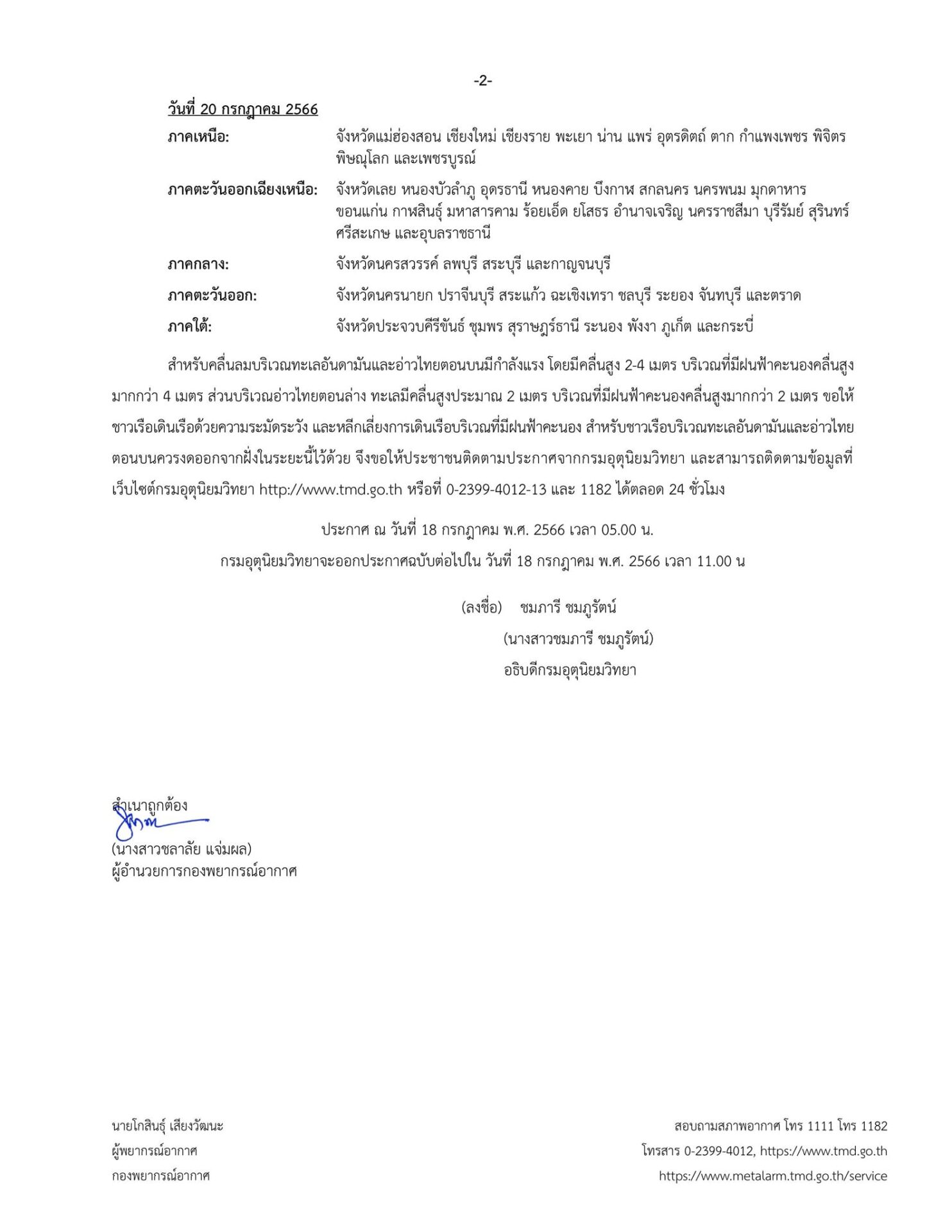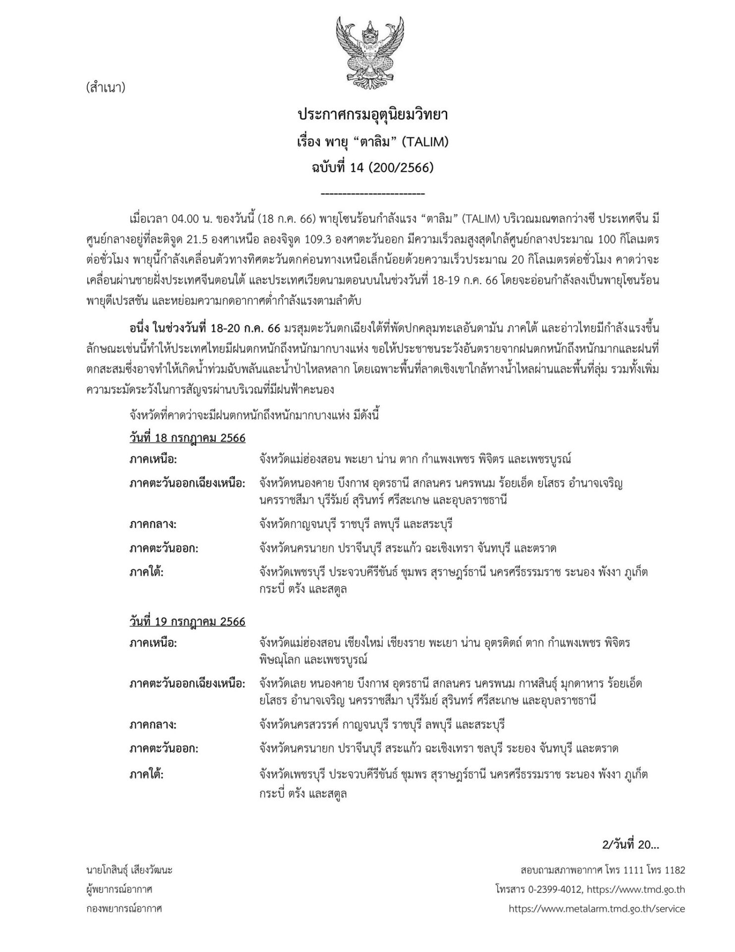 อนึ่ง พายุโซนร้อนกำลังแรง “ตาลิม” ได้เคลื่อนขึ้นฝั่งบริเวณเมืองจั้นเจียง มณฑลกวางตุ้ง ประเทศจีนแล้ว พายุนี้กำลังเคลื่อนตัวทางทิศตะวันตกค่อนทางเหนือเล็กน้อย คาดว่าจะเคลื่อนผ่านชายฝั่งประเทศจีนตอนใต้และประเทศเวียดนามตอนบน ในช่วงวันที่ 18-19 ก.ค.66 โดยจะอ่อนกำลังลงเป็นพายุโซนร้อน พายุดีเปรสชัน และหย่อมความกดอากาศต่ำกำลังแรง ตามลำดับ