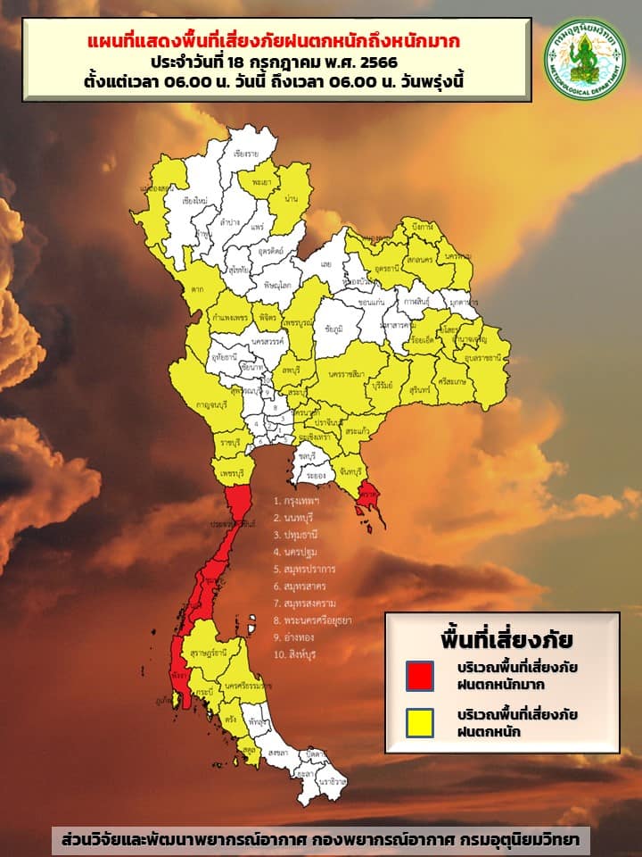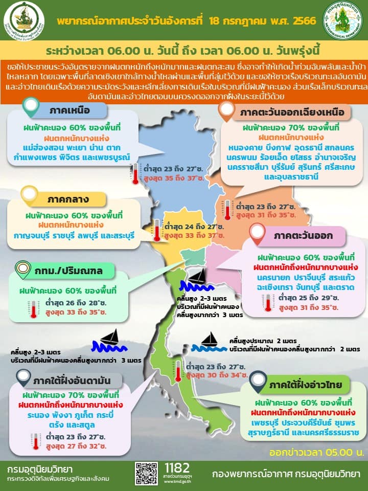 กรมอุตุนิยมวิทยา พยากรณ์อากาศ 24 ชั่วโมงข้างหน้า ร่องมรสุมพาดผ่านภาคเหนือตอนบนและภาคตะวันออกเฉียงเหนือตอนบน ประกอบกับมรสุมตะวันตกเฉียงใต้ที่พัดปกคลุมทะเลอันดามัน ภาคใต้ และอ่าวไทย มีกำลังค่อนข้างแรง ลักษณะเช่นนี้ทำให้ประเทศไทยมีฝนเพิ่มขึ้นและมีฝนตกหนักบางแห่ง โดยมีฝนตกหนักมากบางพื้นที่ในภาคตะวันออกเฉียงเหนือ ภาคตะวันออก และภาคใต้ ขอให้ประชาชนบริเวณดังกล่าวระวังอันตรายจากฝนตกหนักถึงหนักมากและฝนตกสะสม ซึ่งอาจทำให้เกิดน้ำท่วมฉับพลันและน้ำป่าไหลหลาก โดยเฉพาะพื้นที่ลาดเชิงเขาใกล้ทางน้ำไหลผ่านและพื้นที่ลุ่ม