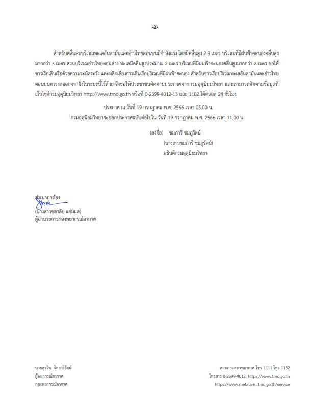 สำหรับทะเลอันดามันและอ่าวไทยตอนบนมีคลื่นสูง 2-3 เมตร บริเวณที่มีฝนฟ้าคะนองคลื่นสูงมากกว่า 3 เมตร ส่วนอ่าวไทยตอนล่างมีคลื่นสูงประมาณ 2 เมตร บริเวณที่มีฝนฟ้าคะนองคลื่นสูงมากกว่า 2 เมตร ขอให้ชาวเรือบริเวณทะเลอันดามันและอ่าวไทยเดินเรือด้วยความระมัดระวัง และหลีกเลี่ยงการเดินเรือในบริเวณที่มีฝนฟ้าคะนอง ส่วนเรือเล็กบริเวณทะเลอันดามันและอ่าวไทยตอนบนควรงดออกจากฝั่งในระยะนี้