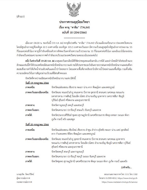 อนึ่ง พายุโซนร้อน “ตาลิม” ได้อ่อนกำลังลงเป็นพายุดีเปรสชัน บริเวณจังหวัดบั๊กกั่น ประเทศเวียดนาม กำลังเคลื่อนตัวทางทิศตะวันตก โดยพายุนี้มีแนวโน้มจะอ่อนกำลังลงเป็นหย่อมความกดอากาศต่ำกำลังแรง บริเวณประเทศเวียดนามตอนบน