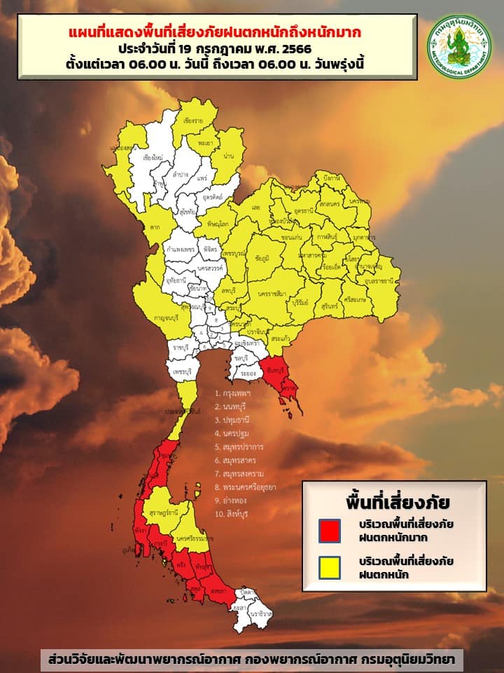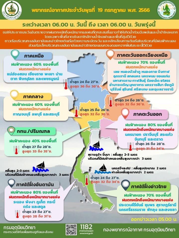 กรมอุตุนิยมวิทยา พยากรณ์อากาศ 24 ชั่วโมงข้างหน้า มรสุมตะวันตกเฉียงใต้กำลังค่อนข้างแรงพัดปกคลุมทะเลอันดามัน ประเทศไทย และอ่าวไทย ลักษณะเช่นนี้ทำให้ประเทศไทยมีฝนฟ้าคะนอง และมีฝนตกหนักบางแห่งในภาคตะวันออกเฉียงเหนือและภาคกลาง โดยมีฝนตกหนักมากบางพื้นที่ในภาคตะวันออกและภาคใต้ ขอให้ประชาชนในบริเวณดังกล่าวระวังอันตรายจากฝนตกหนักถึงหนักมากและฝนที่ตกสะสม ซึ่งอาจทำให้เกิดน้ำท่วมฉับพลันและน้ำป่าไหลหลาก โดยเฉพาะพื้นที่ลาดเชิงเขาใกล้ทางน้ำไหลผ่านและพื้นที่ลุ่ม