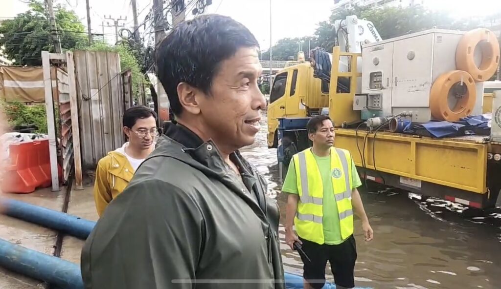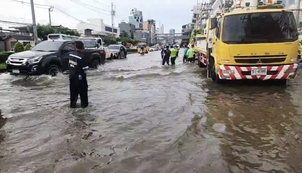 ผู้ว่าฯ ชัชชาติ กล่าวต่อว่า เมื่อคืนฝนตกมาแบบไม่รู้ตัว ตอนก่อนนอนยังไม่เห็นกลุ่มฝน ฝนมาจากทางชลบุรี และเคลื่อนตัวมาอย่างรวดเร็ว เจ้าหน้าที่มาตั้งแต่เที่ยงคืน ตี 1 ตอนนี้สถานการณ์เริ่มดีขึ้นแล้ว เมื่อคืนที่มาตอนตี 2 น้ำท่วมสูงขึ้นถึงหญ้าที่อยู่เกาะกลางถนน แต่ตอนนี้ลดระดับลงมา คาดว่าน่าจะลงมาประมาณ 25 ซม. ยังคงมีอุปสรรคอยู่ แต่คาดว่า 2 ชม. น่าจะเคลียร์ได้หมด เมื่อคืนตก 140 มม. ก็หนักพอสมควร เป็นข้อจำกัดทางกายภาพ เพราะท่อระบายได้ในรับดับนี้ ในระยะยาวคงต้องขยายท่อให้ใหญ่ขึ้น วันนี้มาเป็นกำลังให้กับเจ้าหน้าที่และได้เห็นปัญหา เมื่อคืนเป็นปรากฏการณ์ฝนตกหนักมากเป็นจุดๆ โดยเมื่อคืนมีหลายจุดทั้งพระโขนง บางนา จตุจักร ศาลอาญา จากนี้จะอยู่จนกว่าน้ำจะแห้ง เพราะจุดนี้เป็นจุดสำคัญ เป็นจุดที่มีพื้นที่ต่ำของกรุงเทพฯ อยู่แล้ว เป็นจุดที่รวมน้ำจากบริเวณโดยรอบมารวมกัน ในส่วนจุดอื่นจึงแห้งก่อน เช่น ห้าแยกลาดพร้าว วิภาวดีรังสิต กำแพงเพชร แห้งหมดแล้ว แต่จุดนี้จะแห้งหลังสุด แต่เรานำเครื่องปั๊มมาทั้งหมด 4 ตัว มาอยู่ตรงนี้หมด
