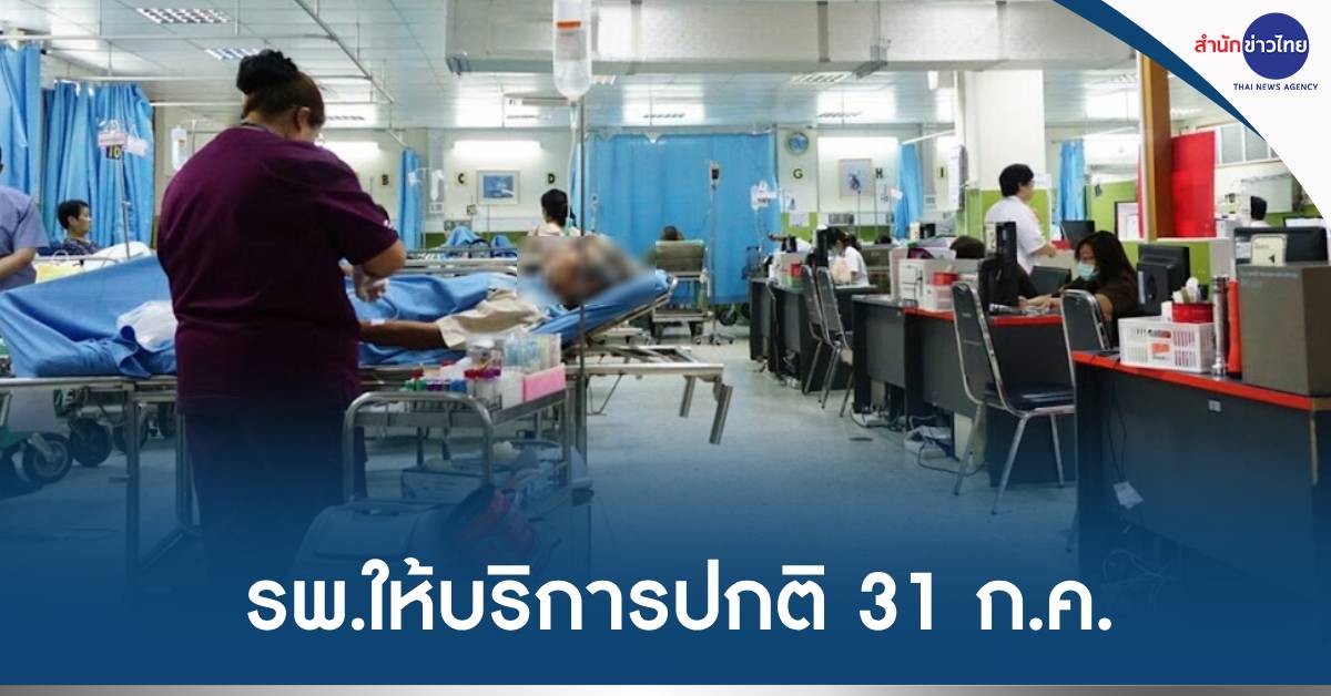 สำนักข่าวไทย 27 ก.ค.-หลายโรงพยาบาล ประกาศเปิดบริการผู้ป่วย 31 ก.ค. ตามปกติ แม้รัฐประกาศให้เป็นวันหยุดยาว 6 วัน เนื่องจากหวั่นคนไข้ได้รับผลกระทบจากการเลื่อนนัด และกลายเป็นภาระงานต้องเพิ่มในสัปดาห์ถัดไป แนะอย่าประกาศหยุดแบบกระชั้นชิด