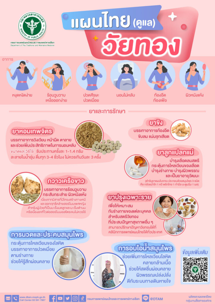 กทม. 30 ก.ค.- กรมการแพทย์แผนไทยและการแพทย์ทางเลือก แนะนำ สตรีวัยทองที่มีอาการเปลี่ยนแปลงทางร่างกายที่เกิดขึ้นเองตามธรรมชาติ เช่น นอนไม่หลับ วิงเวียนศีรษะ หน้ามืด ตาลาย ร้อนวูบวาบ กระสับกระส่าย ผิวหนังแห้ง ท้องอืด ท้องเฟ้อปวดเมื่อยเนื้อตัว ด้วยยาสมุนไพร รวมถึงหัตถการการนวดและประคบสมุนไพร การอบไอน้ำสมุนไพร สามารถช่วยบรรเทาอาการไม่พึงประสงค์สำหรับสตรีวัยทอง ได้เป็นอย่างดี