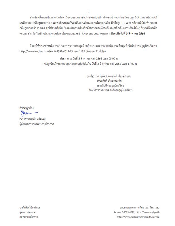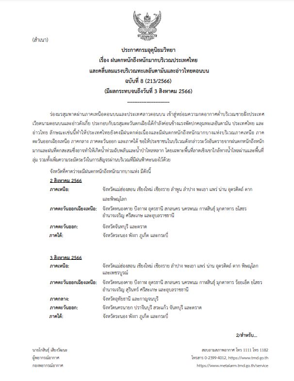 ประกาศกรมอุตุนิยมวิทยา เรื่อง ฝนตกหนักถึงหนักมากบริเวณประเทศไทย และคลื่นลมแรงบริเวณทะเลอันดามันและอ่าวไทยตอนบน ฉบับที่ 8 (213/2566) มีผลกระทบจนถึงวันที่ 3 สิงหาคม 2566