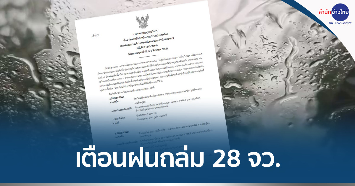 กรุงเทพฯ 2 ส.ค. – กรมอุตุฯ ออกประกาศเตือนฝนตกหนักถึงหนักมาก ฉบับที่ 8 ระวังน้ำท่วมฉับพลัน-น้ำป่าไหลหลาก วันนี้ (2 ส.ค.) ได้รับผลกระทบ 28 จังหวัด ในภาคเหนือ อีสาน ตะวันออก และใต้