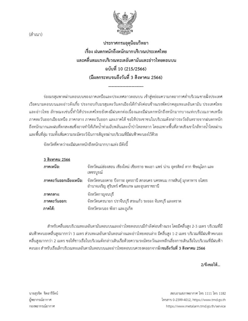 ประกาศกรมอุตุนิยมวิทยา เรื่อง ฝนตกหนักถึงหนักมากบริเวณประเทศไทย และคลื่นลมแรงบริเวณทะเลอันดามันและอ่าวไทยตอนบน ฉบับที่ 10 (215/2566) มีผลกระทบจนถึงวันที่ 3 สิงหาคม 2566