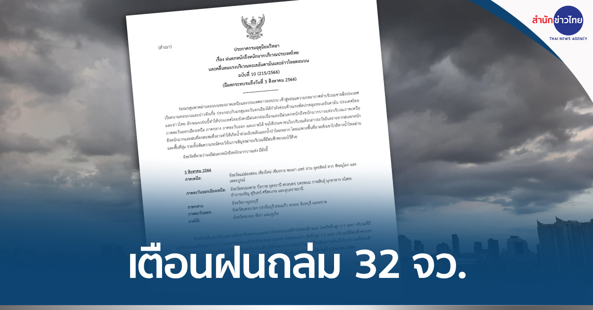 กรุงเทพฯ 3 ส.ค. – กรมอุตุฯ ออกประกาศ ฉบับที่ 10 เตือนฝนตกหนักถึงหนักมาก 32 จังหวัด วันนี้ (3 ส.ค.) บริเวณภาคเหนือ อีสาน กลาง ตะวันออก และภาคใต้ อาจทำให้เกิดน้ำท่วมฉับพลันและน้ำป่าไหลหลาก