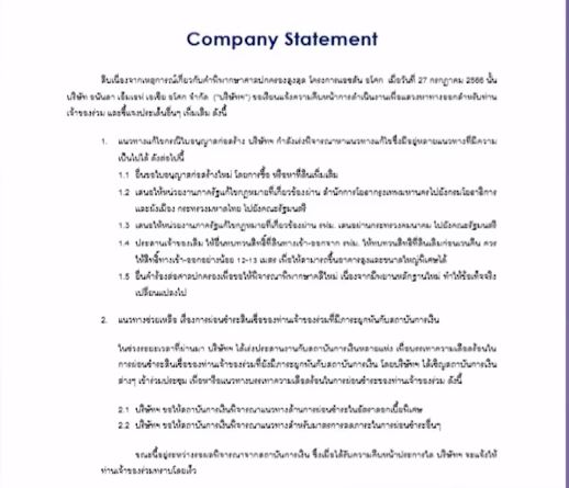 3.ประเด็นชี้แจงอื่นๆ เพิ่มเติม บริษัทฯ ยืนยันว่าลูกค้าของโครงการจึงรับทราบสถานะของคดีมาโดยตลอด พร้อมยืนยันว่าจะร่วมเคียงข้างเจ้าของร่วมทุกท่าน และกำลังเร่งดำเนินการแสวงหาทางออกอย่างสุดความสามารถ โดยจะแจ้งความคืบหน้าให้ทราบโดยเร็ว. -สำนักข่าวไทย