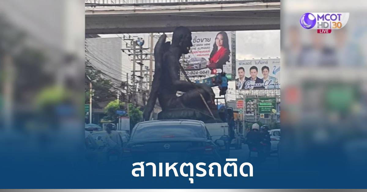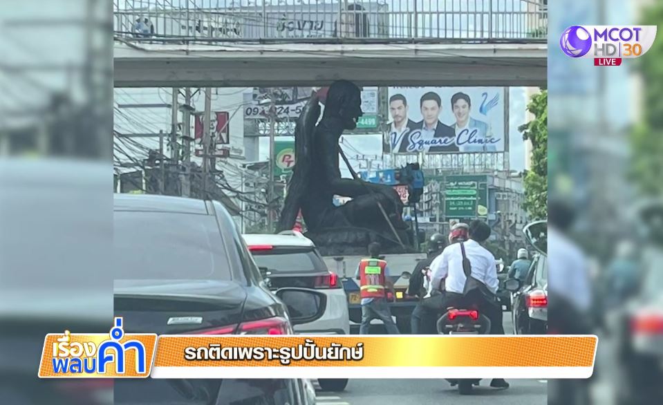 กทม. 9 ส.ค. – ติดหนักแต่เช้า ถ.รัชดาภิเษก ขาเข้า ท้ายแถวยาวถึงสะพานพระราม 7 เหตุจากรูปปั้น “ครูกายแก้ว” ขนาดใหญ่ หัวติดคานสะพานลอย จราจร สน.พหลโยธิน ต้องปล่อยลมยางรถบรรทุกออกเพื่อลดความสูง พร้อมเปรียบเทียบปรับ