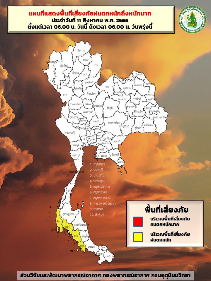 กรมอุตุฯ 11 ส.ค. – กรมอุตุฯ เผยทั่วไทยฝนลดลง แต่ยังคงมีฝนตกหนักบางแห่งในภาคใต้ฝั่งตะวันตก ส่วนกรุงเทพฯ และปริมณฑล ฝนฟ้าคะนอง 30% ของพื้นที่
